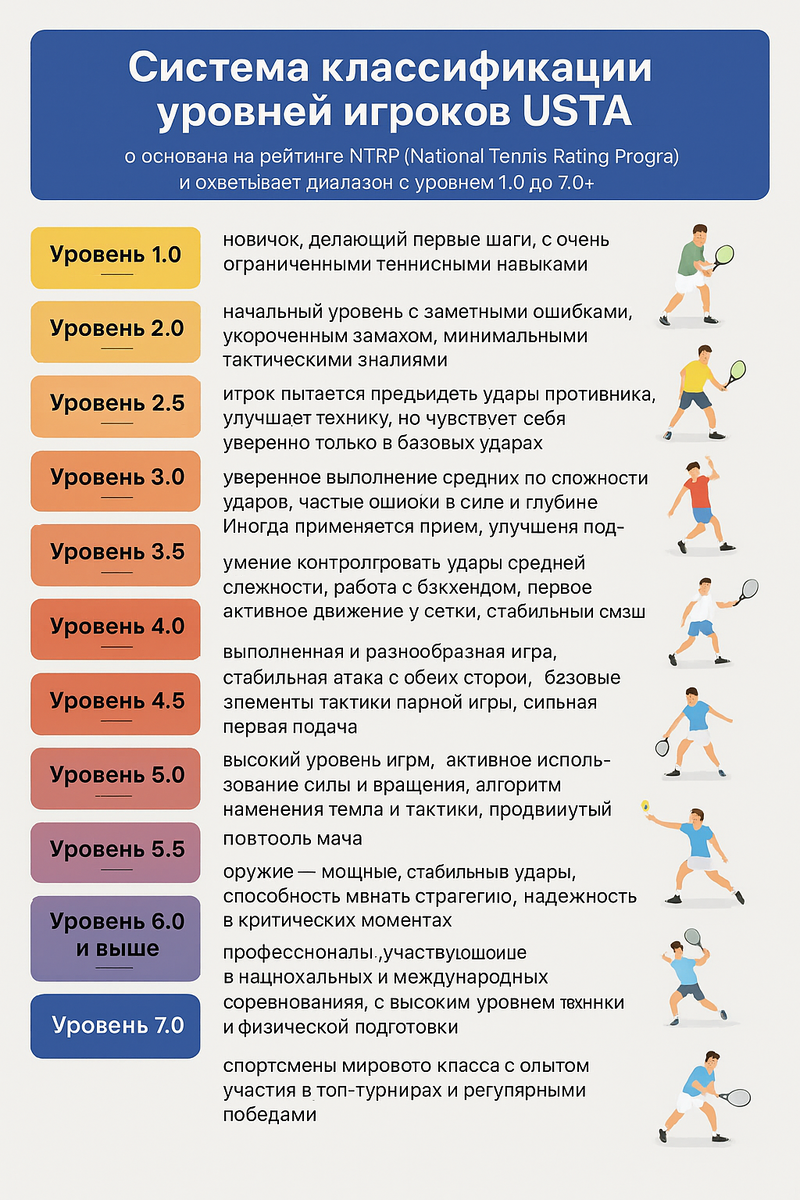 Система классификации уровней игроков USTA основана на рейтинге NTRP (National Tennis Rating Program) и охватывает диапазон с уровнем 1.0 до 7.0+, подробно описывая навыки и умения для каждого этапа: - Уровень 1.0–1.5: новичок, делающий первые шаги, с очень ограниченными теннисными навыками. Неустойчивые удары, слабый контроль мяча, малая координация. - Уровень 2.0: начальный уровень с заметными ошибками, укороченным замахом, минимальными тактическими знаниями. Игрок неуверенно играет подачу и редко использует бэкхенд. - Уровень 2.5: игрок пытается предвидеть удары противника, улучшает технику, но чувствует себя уверенно только в базовых ударов. - Уровень 3.0: уверенное выполнение средних по сложности ударов, частые ошибки в силе и глубине. Иногда применяется прием, улучшена подача. - Уровень 3.5: умение контролировать удары средней сложности, работа с бэкхендом, первое активное движение у сетки, стабильный смэш. - Уровень 4.0: выполненная и разнообразная игра, стабильная атака с об