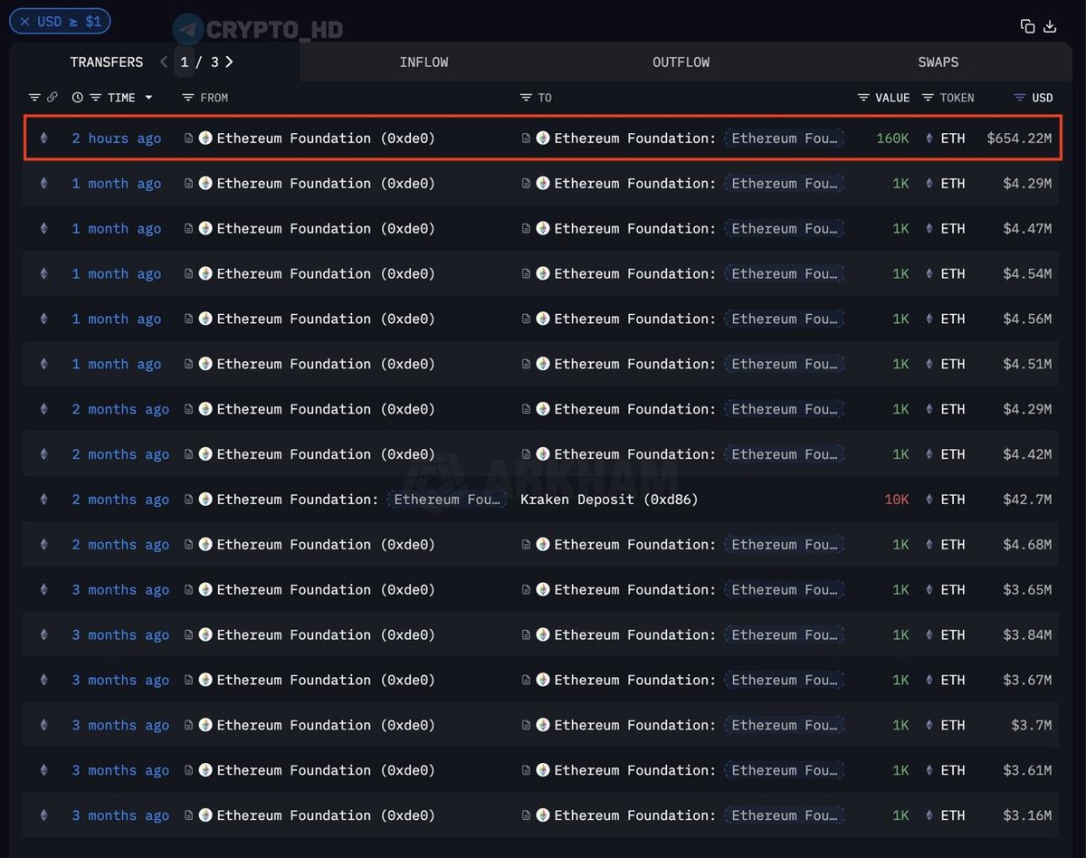 💸 #ETH Из Ethereum Foundation перевели 160,000 ETH ($654m) на кошелек, который ранее использовался только для продаж (Arkham
