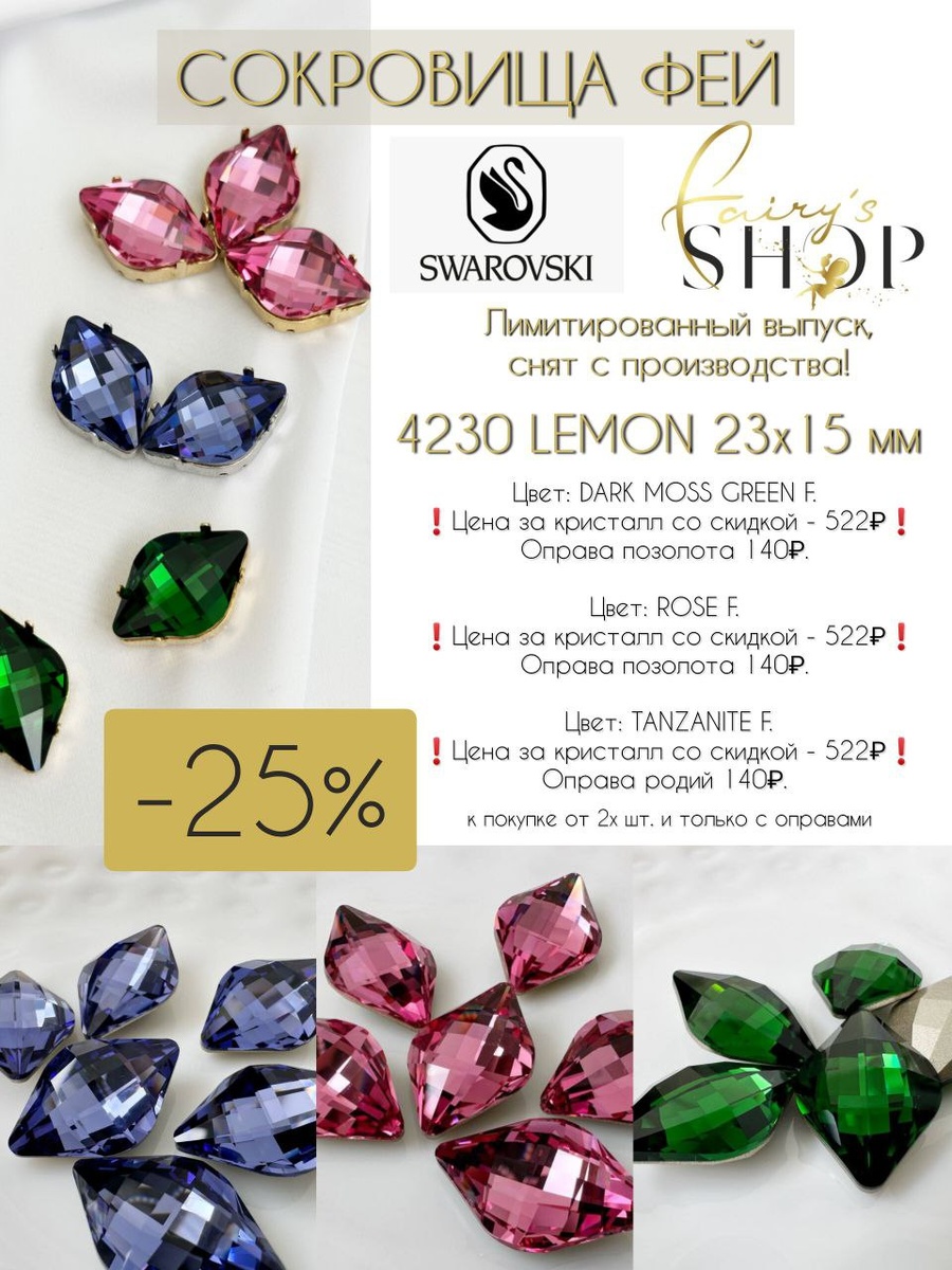 ⚡️🔮Последний день, когда Вы можете урвать редкость - Кристаллы Swarovski Артикул 4230 LEMON по супер-цене! 🔮⚡️ ⚡️СНЯТЫ С ПРОИЗВОДСТВА! Эти малыши из лимитированной серии и их уже нет даже в Австрии! Доступны к покупке от 2х шт. и только с оправами❗️ 🎉Суперскидка -25% только с 20 по 22 октября, или до момента СОЛДАУТ🎉 💚Артикул 4230 LEMON 23x15 мм Цвет: DARK MOSS GREEN F. Цена за кристалл 696₽. ❗️Цена за кристалл со скидкой -25% - 522₽❗️ Оправа позолота 140₽. Остаток - 23 шт. В наличии! К закупке от 2 пар: 2 кристалла+2 оправы. 🩷Артикул 4230 LEMON 23x15 мм Цвет: ROSE F. Цена за кристалл 696₽. ❗️Цена за кристалл со скидкой -25% - 522₽❗️ Оправа позолота 140₽. Остаток - 24 шт. В наличии! К закупке от 2 пар: 2 кристалла+2 оправы. 💜Артикул 4230 LEMON 23x15 мм Цвет: TANZANITE F. Цена за кристалл 696₽. ❗️Цена за кристалл со скидкой -25% - 522₽❗️ Оправа родий 140₽. Остаток - 27 шт. В наличии! К закупке от 2 пар: 2 кристалла+2 оправы. 👉🏻Вступить в группу Совместной Закупки FAIRY’S S