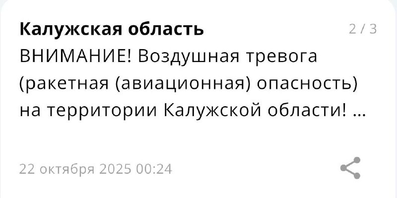 Воздушная тревога (ракетная (авиационная) опасность) на территории Калужской области.