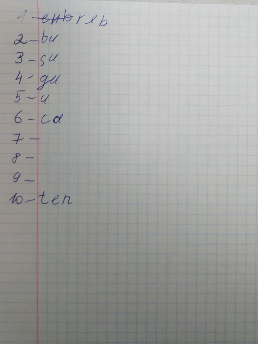 Начали с тех, что пишутся и читаются по правилам: five, six, seven, nine, ten. Написали, разобрали, еще раз написали.