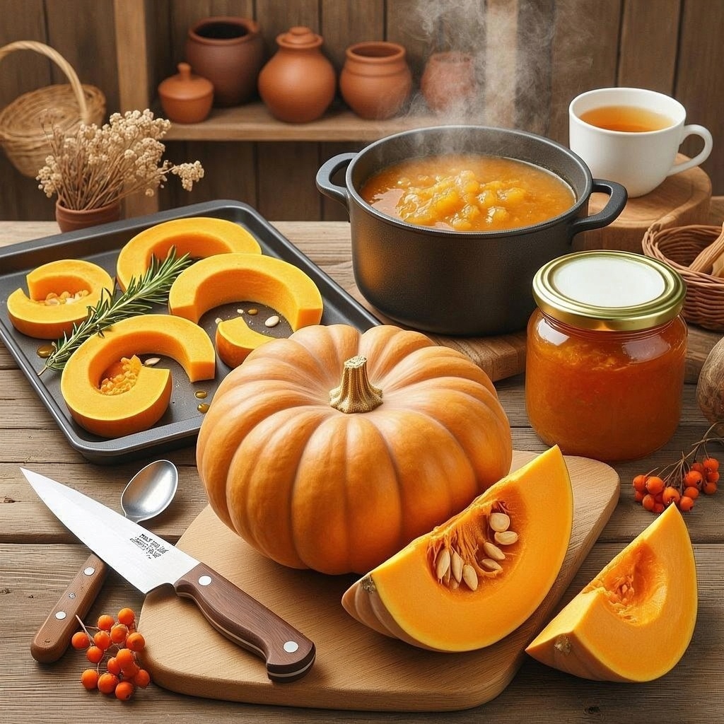 Тыква является одним из любимых овощей многих россиян благодаря своему сладковатому вкусу и богатой витаминно-минеральной композиции. Она богата витаминами A, C, E, B-группы, микроэлементами (калий, магний, железо). Тыква прекрасно подходит для приготовления вкусных блюд, особенно осенью и зимой, когда организм нуждается в дополнительной поддержке иммунитета. Полезные свойства тыквы Перед приготовлением важно отметить полезные качества овоща: - Витамины: Витамин А улучшает зрение, укрепляет иммунитет, способствует здоровью кожи и волос. - Микроэлементы: Калий помогает поддерживать работу сердца, магний полезен для нервной системы, железо повышает уровень гемоглобина. - Низкая калорийность: Подходит для диетического питания. Кроме того, мякоть тыквы легко усваивается организмом, что позволяет употреблять её людям с проблемами пищеварения. Основные способы приготовления тыквы: 1 Запечённая тыква Запечь тыкву проще всего. Это самый быстрый способ сохранить максимум полезных вещес