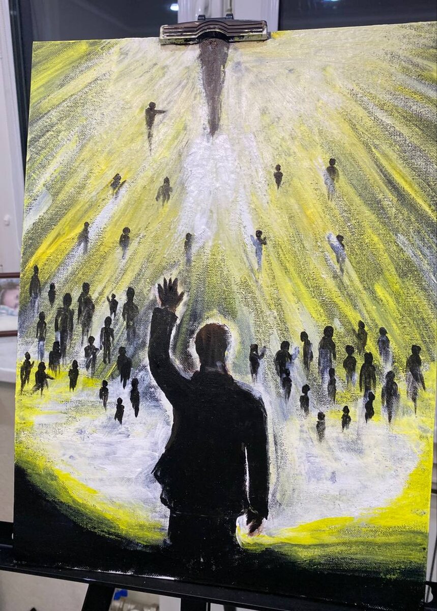 #творчество Давно приснился интересный сон, где я видел знакомого мне человека который стоял перед светом, в самом свете было множество силуэтов других людей, он повернулся ко мне и произнес фразу, смотри Юр, этот свет будто живой. После узнаю что одного из наших товарищей не стало. Так вот, я конечно никогда в жизни не рисовал, но решил запечатлеть этот образ на полотне, поэтому не судите строго, для первого раза думаю пойдет 😁 В этом посте есть большое видео, которое не загрузилось в Дзен. Откройте оригинал поста в телеграме, чтобы его посмотреть