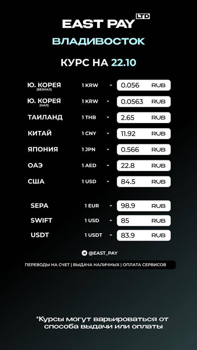 МЕЖДУНАРОДНЫЕ ПЕРЕВОДЫ 🔘SWIFT / SEPA переводы 🔘Пополнение зарубежных счетов 🔘Выдача наличных за границей 🔘Криптовалюты ВНИМАНИЕ: в течение дня курс может меняться. Рекомендуем уточнять актуальный курс у менеджера 🔴🔴🔴🔴🔴🔴🔴 💸 Написать менеджеру: @east_pay_world 💸Самостоятельный просчет в боте: @East_PaySer_bot ✅East Pay