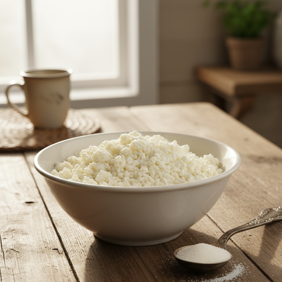 Главное правило: нам нужен сухой творог. Если творог слишком влажный, сырники потекут, даже если туда добавить полкилограмма муки. Поэтому берите 5% или 9% жирности, но не пастообразный, а рассыпчатый. Если ваш творог всё равно влажный, просто отожмите его через марлю или откиньте на сито.