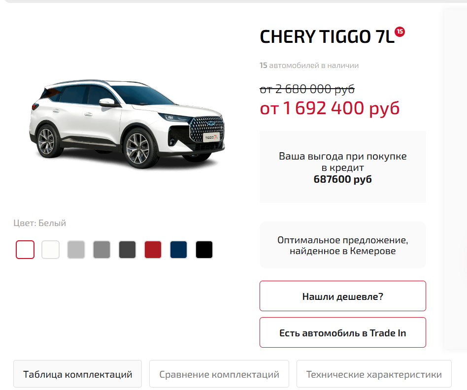 - Стас, - говорю, - вот смотри. Официальный документ с сайта Chery. Tiggo 7L 2025 года. Комплектация 'Active' 2WD - 2.680.000. 'Prime' 2WD - 2.880.000. 'Ultra' 2WD - 3.000.000. Есть даже полноприводные версии 'Prime' за 3.080.000 и 'Ultra' за 3.230.000. Машины у дилеров есть. А то, что у вас на сайте за 1.64 - это просто вранье. Наглый, откровенный обман.