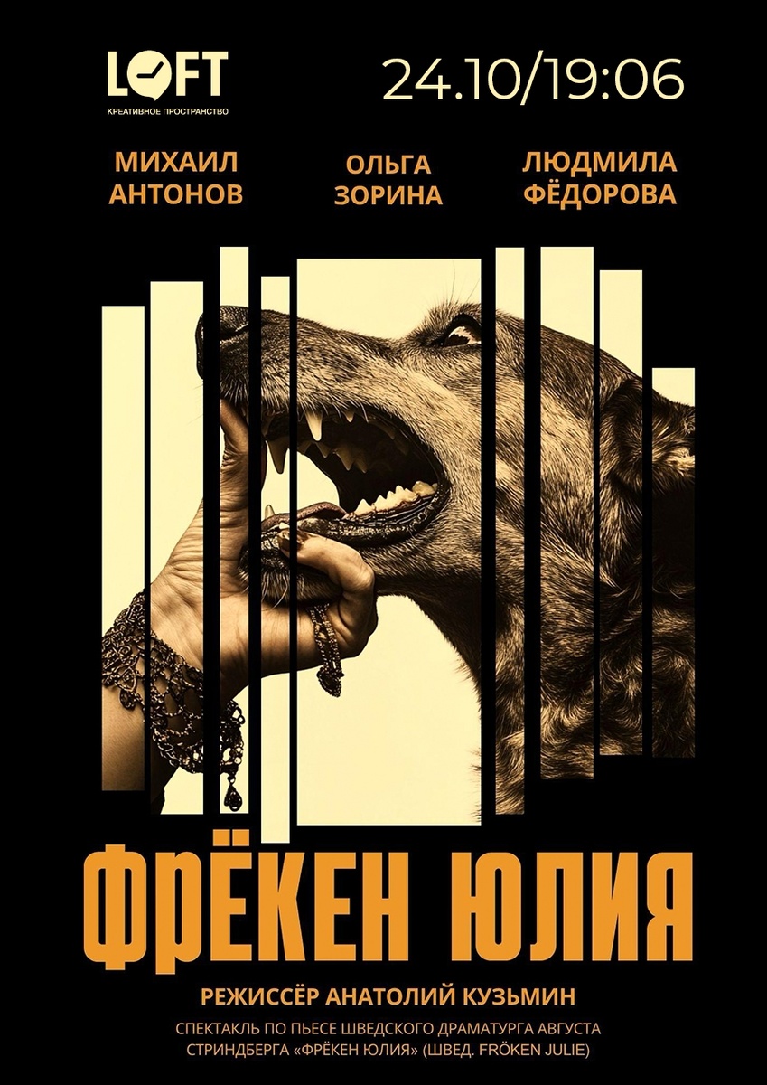 🎭 Август Стриндберг - «Фрёкен Юлия» Не упустите шанс увидеть один из самых ярких спектаклей сезона! После успешной премьеры с аншлагом, где зрители пережили настоящие эмоции, спектакль возвращается в репертуар Лофта👏 Если вы не успели на первый показ, теперь у вас есть шанс увидеть его. 🎞 О чём «Фрёкен Юлия»? Это мощная психологическая драма, в которой три человека оказываются в одной комнате на одну ночь.Социальные маски, власть, любовь, страх одиночества, всё это сталкивается в напряжённой и глубокой истории. Кухня становится полем битвы, где рушатся иллюзии и появляются смелые признания. 💡 Особенности спектакля Это не просто театральная постановка. Здесь переплетаются психологическая глубина, энергия актёров и яркие визуальные решения. Видео, свет и пластика создают уникальную атмосферу, которая полностью поглощает зрителя. 🎬 Постановочная группа: Режиссёр: Анатолий Кузьмин Хореограф: Илона Гончар Светооператор: Сергей Ромашев Звукооператор: Юрий Затравкин 👥 Актёрский