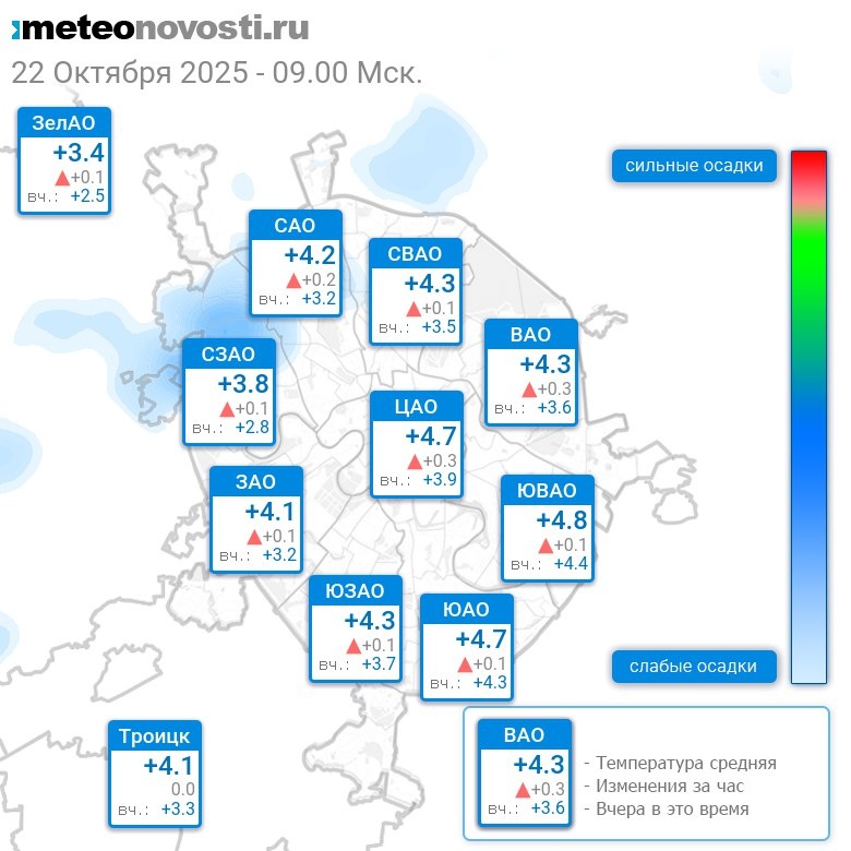 В 9:00 в Москве было от +3.3°C до +5°C, средняя температура +4.3°C #погода #Москва #осень #температура #22октября #среда Перейти на сайт Прогноз погоды на 14 дней