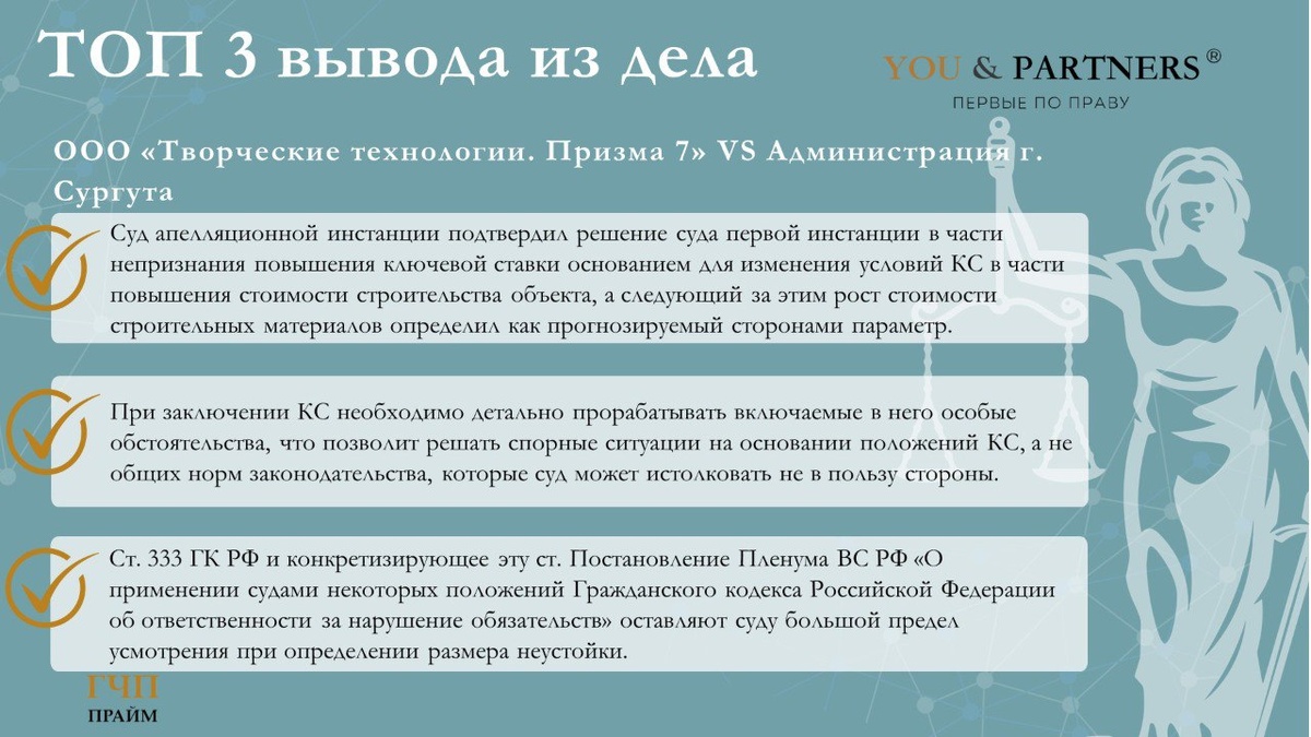 🔘При заключении КС необходимо детально прорабатывать включаемые в него особые обстоятельства, что позволит решать спорные ситуации на основании положений КС, а не общих норм законодательства, которые суд может истолковать не в пользу стороны.