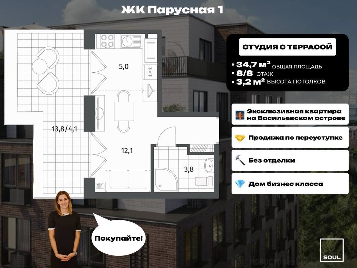 Единственная студия на Васильевском острове с высокими потолками и большой террасой на последнем этаже в ЖК бизнес класса!