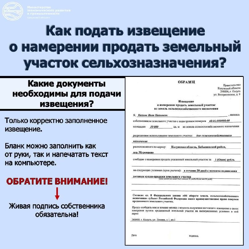 😉 Жители Калужской области часто обращаются к нам с вопросом: как подать извещение о намерении продать земельный участок сельхозназначения