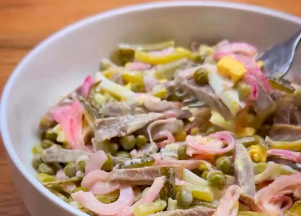Говяжий язык отварить до готовности и нарезать мелкими кубиками или соломкой, как больше любите. Солёные огурчики и отварные яйца также мелко нарезать. Добавить консервированный горошек. Смешать всё с маринованным луком и заправить майонезом. ☝СОВЕТЫ: Для яркости вкуса маринуйте лук заранее — он становится мягче и приобретает приятную кикислинку. Салат подавать охлаждённым. Всем мира, добра, красоты!