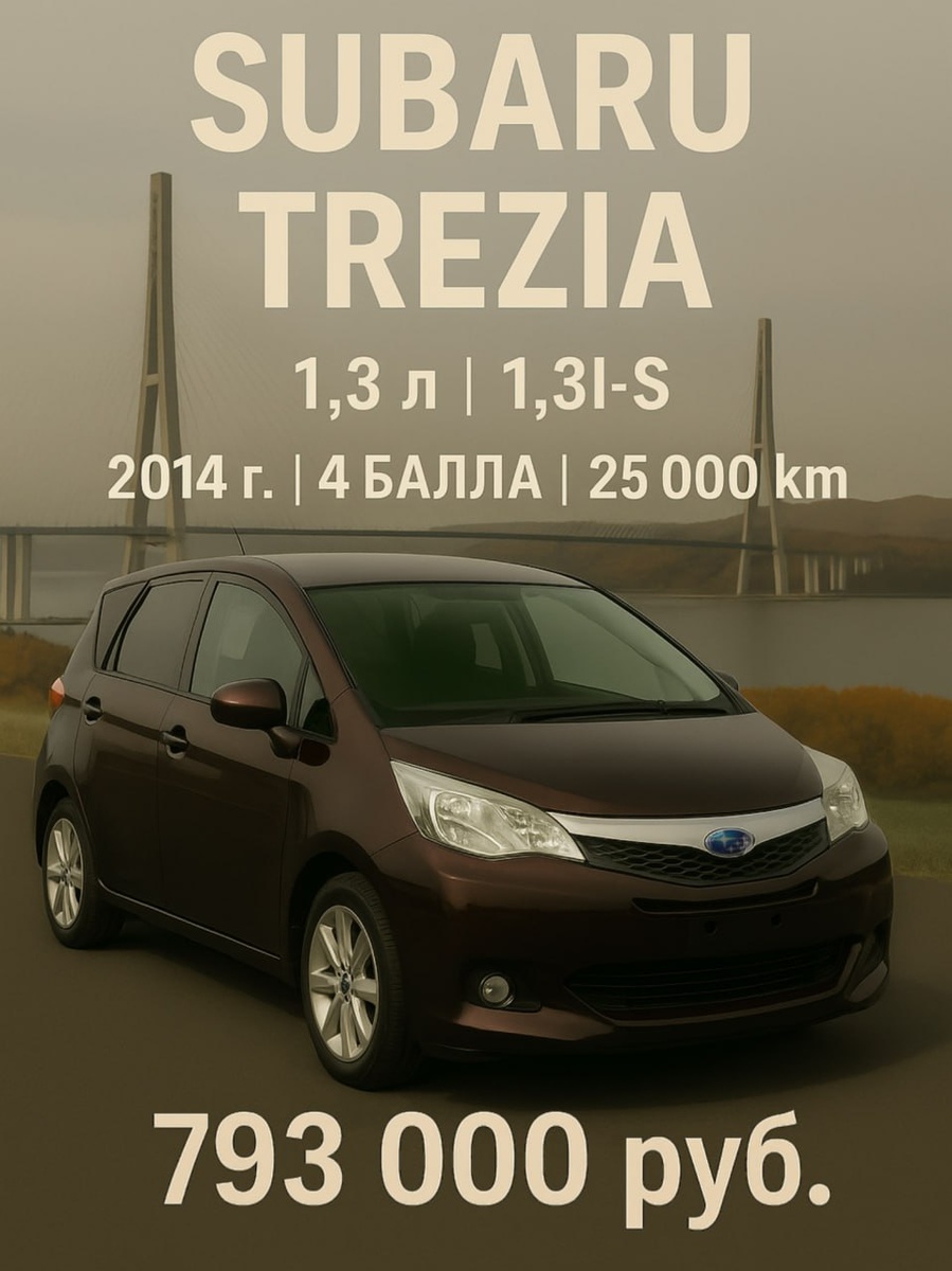 Купили для нашего заказчика 🇯🇵 SUBARU TREZIA , 95 л.с. 290 000 йен цена на аукционе 💹 Дата торгов 30.09.2025, курс йены: 0.588 794 000 руб. цена под ключ во Владивостоке Обращайтесь к нашим менеджерам для бесплатной консультации: +7 951 010-52-52 Ярослав Константинович (Япония, Корея) +7 963 515-52-52 Алексей Сергеевич (Китай) Больше фото в комментариях, @noharaautos