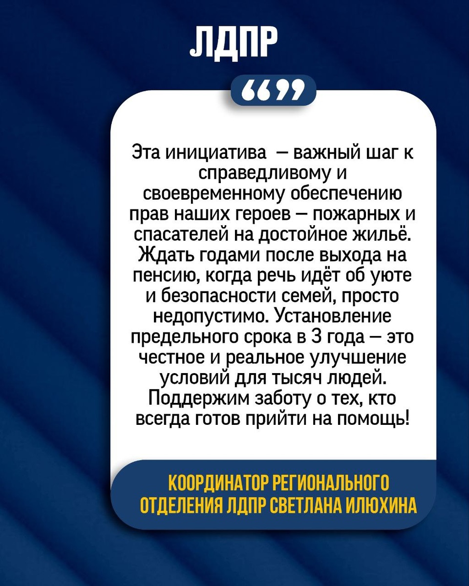 ЛДПР предлагает зафиксировать срок жилищной выплаты пенсионерам МЧС ЛДПР выступает с важной инициативой — установить чёткие сроки выплаты единой социальной выплаты (ЕСВ) на покупку жилья для пенсионеров МЧС — пожарных и спасателей. С 2027 года все пенсионеры МЧС, вставшие в очередь на выплату до этого года, смогут получить выплату в течение трёх лет — это обеспечит социальную защиту тех, кто уже долго ожидает. Начиная с 2030 года закон закрепит, что все пожарные и спасатели, выходя на пенсию, должны получить выплату на жильё не позднее 3 лет с момента увольнения — сейчас люди ждут иногда по десятилетиям без какой-либо гарантии. Сегодня в очереди стоят почти 11 000 сотрудников МЧС, сумма выплат превышает 10 млн рублей, половина из них уже пенсионеры — новая норма даст ясность и справедливость для всех. #лдпр