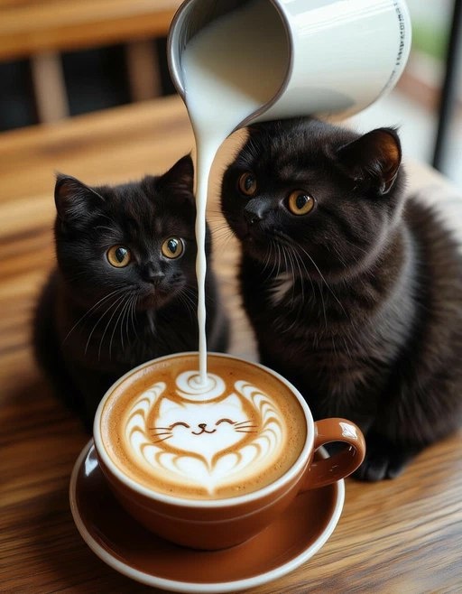 Доброе утро! Latte art, top view. The drawing from above shows a cartoon miniature cat, drawn in pencil, in the foam of the cup. Next to the cup sits a fluffy, downy black kitten, resting its paws on the rim of the cup, looking into the cup. The cup is filled with white foam, and milk pours from the jug above, splashing cream. ______________________ Если вам удобней, то ВК здесь —-> https://vk.com/aicreativ Телеграм здесь--->https://vk.cc/cQkfRI (ВК «не любит» сторонние ссылки). #neuroart #нейроарт #ai #ии #нейросеть #картинки #искусственныйинтеллект #цифровоеискусство #digitalart #арт #art #prompt #промпт #подсказка