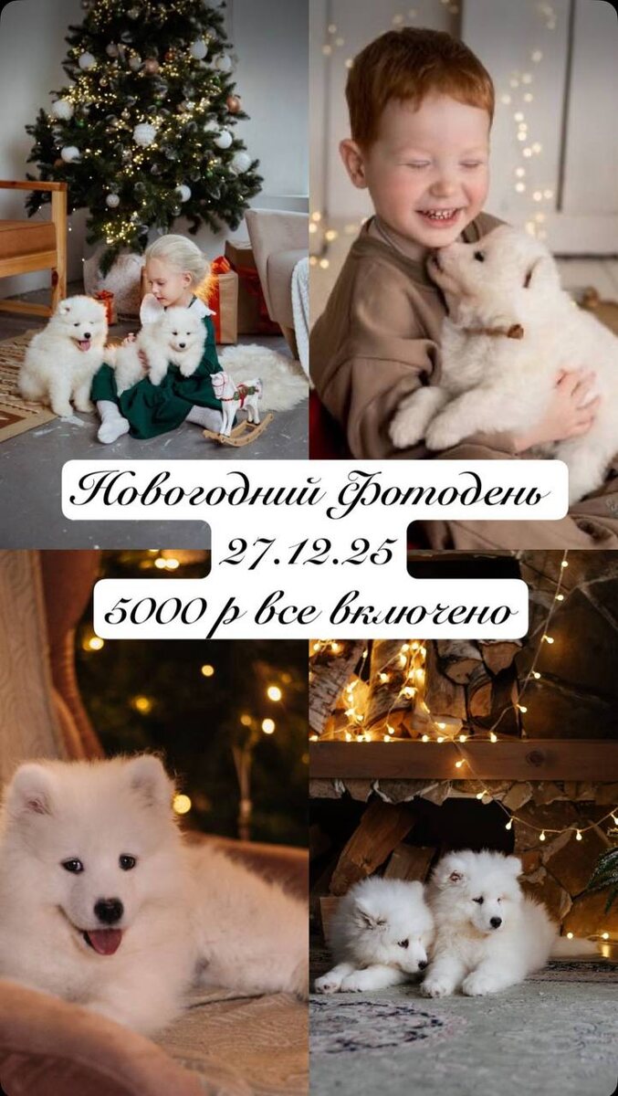 🐾✨ Новогодняя сказка в кадре — ты и пушистые самоеды! ✨🐾 🎄 Новогодний фото-день с самоедами — для тех, кто хочет волшебные снимки и море эмоций. Белоснежные щенки, мерцающие огни и ты — в центре этой зимней истории. 📸 В стоимость 5000 ₽ включено: — аренда новогодней студии — очаровательные щенки самоеды — работа профессионального фотографа 📅 27 декабря 2025| 📍фотостудия moon Внимание ! Съемка длится 20 минут Количество мест ограничено — щенки не смогут обнять всех 😅 Пиши, чтобы забронировать свое время ❤️