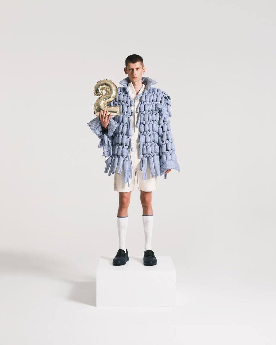 Какая же у них талантливая молодежь! И дары леса, видимо, хороши. Особенно - грибы! А вот сами посудите: во Франции, в Йере, завершился 40-й Международный фестиваль моды, фотографии и аксессуаров. Выбирали самых талантливых. Среди дизайнеров победителем стал Лукас Эмилио Бруннер — выпускник брюссельской Национальной школы изобразительных искусств La Cambre. Вот, например, что нынче считается прорывом: Или вот этот шедевр: Посмотрите внимательно, что это у него на штанах. Вы подумали - ткань отрастила хобот и орет: "Помогите! Лучше в Северную Корею на флаги, чем вот это вот!"... Ан, нет! Это воздушный шарик изображает. Его пимпочку! Вот еще: Просто этот Бруннер при создании своих творений вдохновлялся воздушными шарами... Это он сам рассказал. Ну, конечно, это первый приз. Ишь, какие красивые штопанные... шарики! Видели рейтузы с ушками? Вот, на трубе играет. Не ругайтась, что я их не по номерам выложила. Я просто так восхитилась, аж считать разучилась... Как думаете, теплая кур
