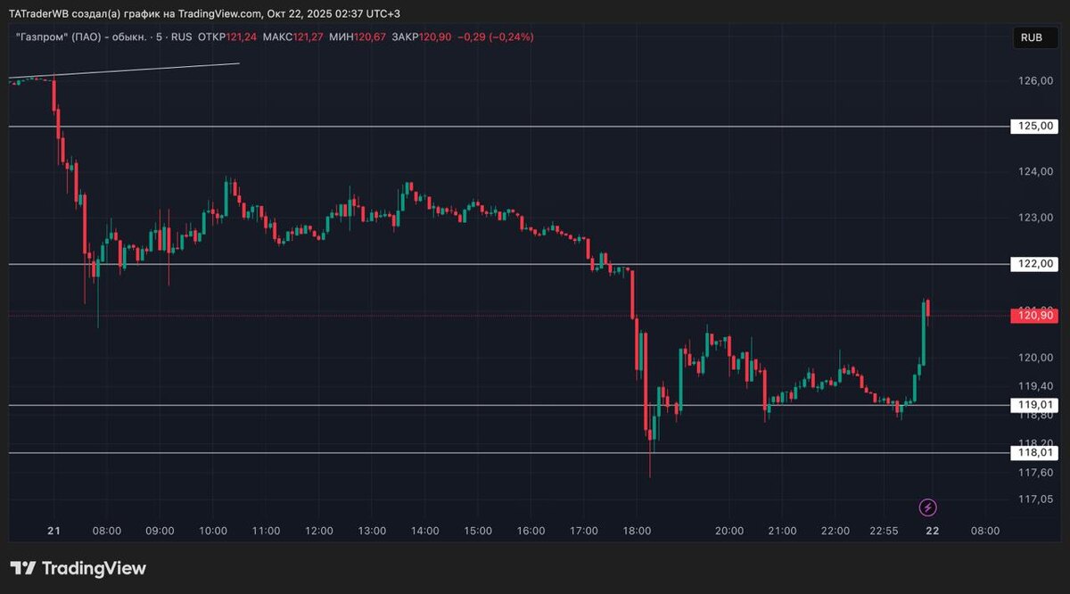 ❌ Стоп поставлю 0,5%, считается от уровня 122. Тейк +1-1,5%. При достижении +0,5% поставлю стоп в без убыток. Больше идей в Базе. Это условие торговли, то есть если будет вход, зайду. Не будет входа, НЕ зайду. Газпром Актуален, пока он торгуется выше 120. Как только Газпром уйдет ниже 120 - идея не актуальна.