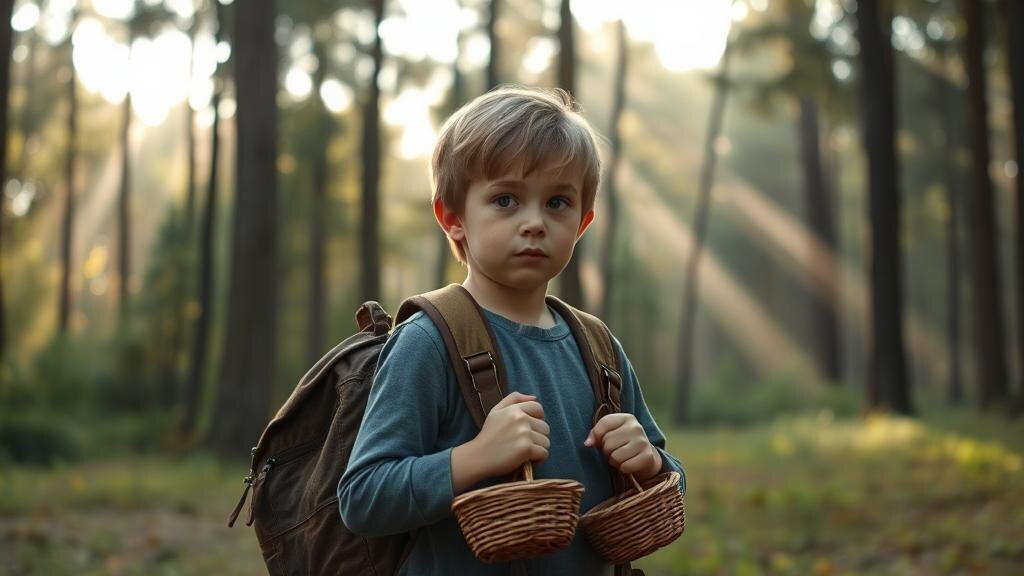 Однажды между двумя соснами Ване показалось, что он увидел сразу несколько рыжих пятен среди мха. Он осторожно отошёл чуть дальше от тропинки, присел, чтобы рассмотреть находку поближе: это оказалась целая группа лисичек, таких, каких дед хвалил чуть раньше. Радость захватила его полностью, он стал собирать грибы одну за другой, аккуратно складывая их в свою корзину, совсем забыв, что надо смотреть по сторонам. Когда поднялся, его взгляд упёрся только в высокие стволы вокруг — никого не было, ни одного знакомого силуэта, ни голоса, ни шагов, только приглушённый шелест листьев да редкое потрескивание сучьев где-то сбоку. Ваня замер — сердце заколотилось быстрее, чем обычно. Кажется, он впервые остался один посреди большого осеннего леса, даже если всего лишь ненадолго. Страх пришёл сразу, но вместе с ним всплывали слова деда: оставайся на месте, если потеряешь меня, зови громко — я обязательно откликнусь. Хотелось сразу позвать, но голос сперва прозвучал тихо, едва ли громче дыхания. Потом решительнее: