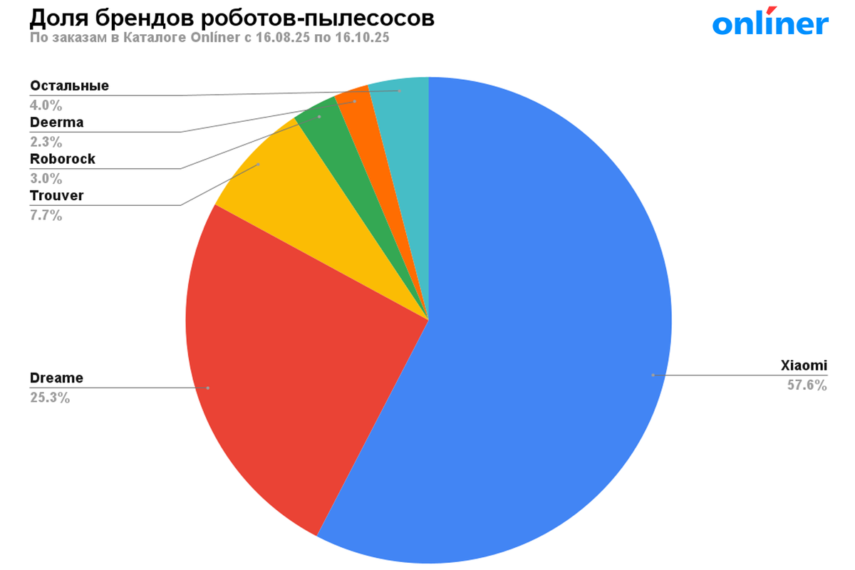 По информации из Каталога Onlíner, на долю роботов-пылесосов Xiaomi приходится больше половины всех заказов. Вдвое меньше у активно развивающегося Dreame. Замыкает тройку лидеров Trouver, который пока все еще слегка недооценен пользователями, несмотря на наличие удачных и даже уникальных моделей.