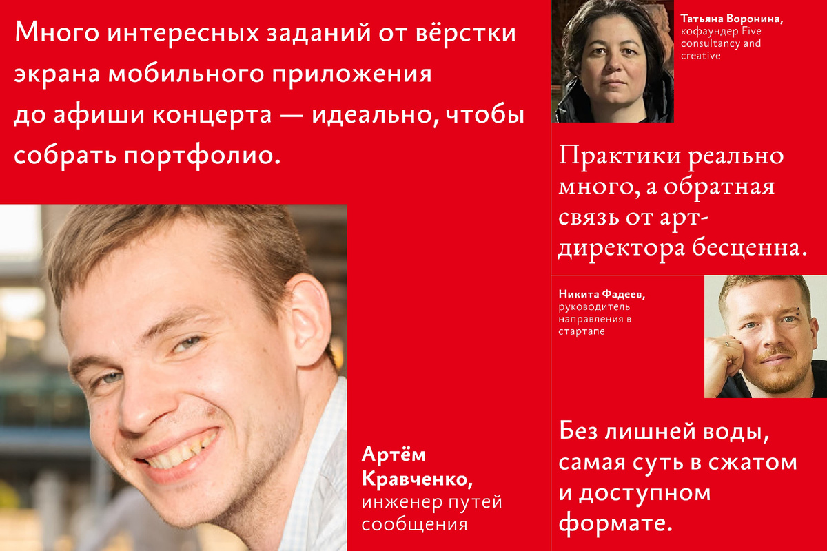 «Много интересных заданий от вёрстки экрана мобильного приложения до афиши концерта — идеально, чтобы собрать портфолио».