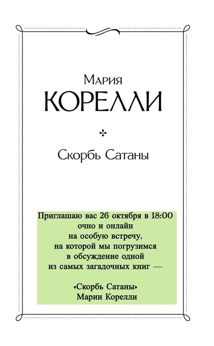 Дорогие друзья! ❤️ Приглашаю вас 26 октября в 18:00 на особую встречу в нашем центре, где мы погрузимся в обсуждение одной из самых загадочных книг — «Скорбь Сатаны» Марии Корелли. Для меня это произведение — из числа самых сложных и глубоких. По своей силе и масштабу оно стоит на одной ступени с «Мастером и Маргаритой», заставляя задуматься о вечных вопросах: искушении, богатстве, душе и её выборе. Всего за полтора часа мы с вами совершим удивительный путь: от алчного и заблудшего человечка — к пробужденной душе, которая учится жить счастливой и творческой жизнью, несмотря на все испытания. Вы можете присоединиться к нам в любом формате: 💻 Онлайн — через Zoom. 🤝 Очно — в нашем центре, став частью живого и теплого круга. Ждём вас 26 октября в 18:00! Продолжительность: ровно 1,5 часа. Запись и все вопросы по номеру: +7 917 488-16-37 Галина А по нашей доброй традиции, всех очных гостей ждёт уютное чаепитие с моим авторским угощением от ЮМ 😊 Встреча будет без оплаты, потому чт