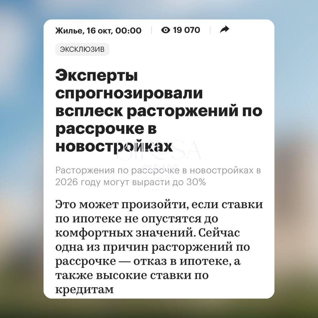 Но, к сожалению, аналитики уже предупреждают — в 2026 году рынок может столкнуться с волной расторжений рассрочек. Прогноз — рост до 20–30%.