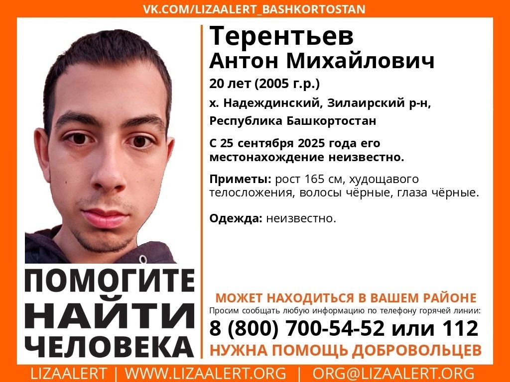Поиски 20-летнего Антона Терентьева из хутора Надеждинский в Зилаирском районе ведут волонтеры отряда «Лиза Алерт РБ». Известно, что молодой человек пропал 25 сентября. Приметы исчезнувшего — брюнет, рост 165 см, худощавое телосложение, черные глаза. Всех, кому известна какая-либо информация о его возможном местонахождении, просят сообщить по телефону 8-800-700-54-52 или 112.