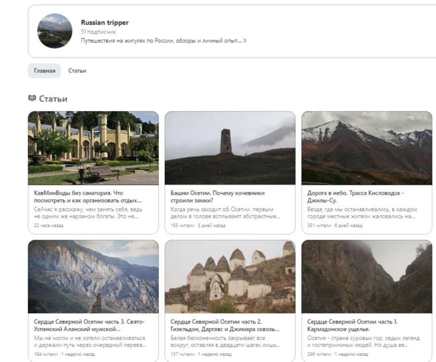 Ещё есть не минус, но нюанс, который может повлиять на продвижение: сейчас у канала все публикации посвящены только теме путешествия по Северному Кавказу – это слишком узкая ниша. Поэтому, прогнозирую, что с выходом новых публикаций про другие места, канал может серьёзно "просесть" в показах. Причина: автор сам "заточил" под это алгоритм.