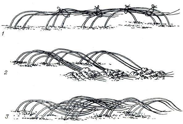 На третьем рисунке показано, как можно не привязывать, а переплетать побеги, подсовывая предыдущий пучок под следующий.