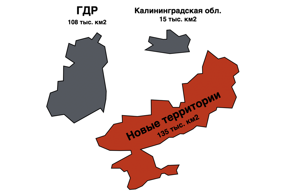 Эти земли стоили многого: миллионы человеческих жизней, колоссальные разрушения, трагедии блокады, потеря значительной части экономического потенциала. В рамках этих жертв справедливой компенсацией со стороны Германии могла бы стать гораздо большая территория. Однако фактически было получено лишь 15 тысяч квадратных километров. Хотя также под контроль СССР перешла ГДР площадью 108 тысяч квадратны