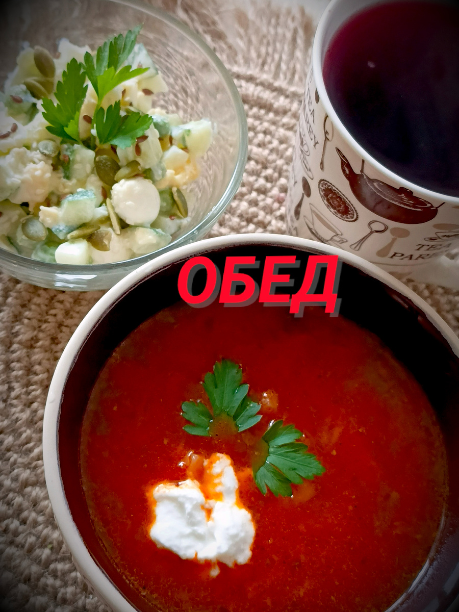 А, что у меня было на первый перекус, догадались? 😉 Конечно сливы, пара штук. Не зря же я их купила. Они крупные и в них очень маленькие косточки. Вкусныеее...!!!👍 На обед я приготовила борщ с курицей ещё в понедельник, вчера брала его с собой на работу, ем сегодня и ещё одна порция останется на завтра. Это очень удобно готовить сразу на несколько дней. Хотя я очень люблю готовить, но и мне иногда просто не хочется. А так всегда в холодильнике есть готовая еда и я перестала кусочничать. В борщ я положила квашеную капусту, картошку, морковку, свеклу и лук. Для заправки использовала перечную пасту, что придало блюду особую пикантность. Подавая борщ, я украсила его греческим йогуртом и свежей петрушкой — получилось очень вкусно и насыщенно! Чтобы добавить немного белка в свой обед, я приготовила легкий салат. В него вошли свежие огурцы, зеленый горошек, вареное яйцо и несколько шариков моцареллы. Для аромата я добавила зубчик чеснока и заправила все это греческим йогуртом. При пода