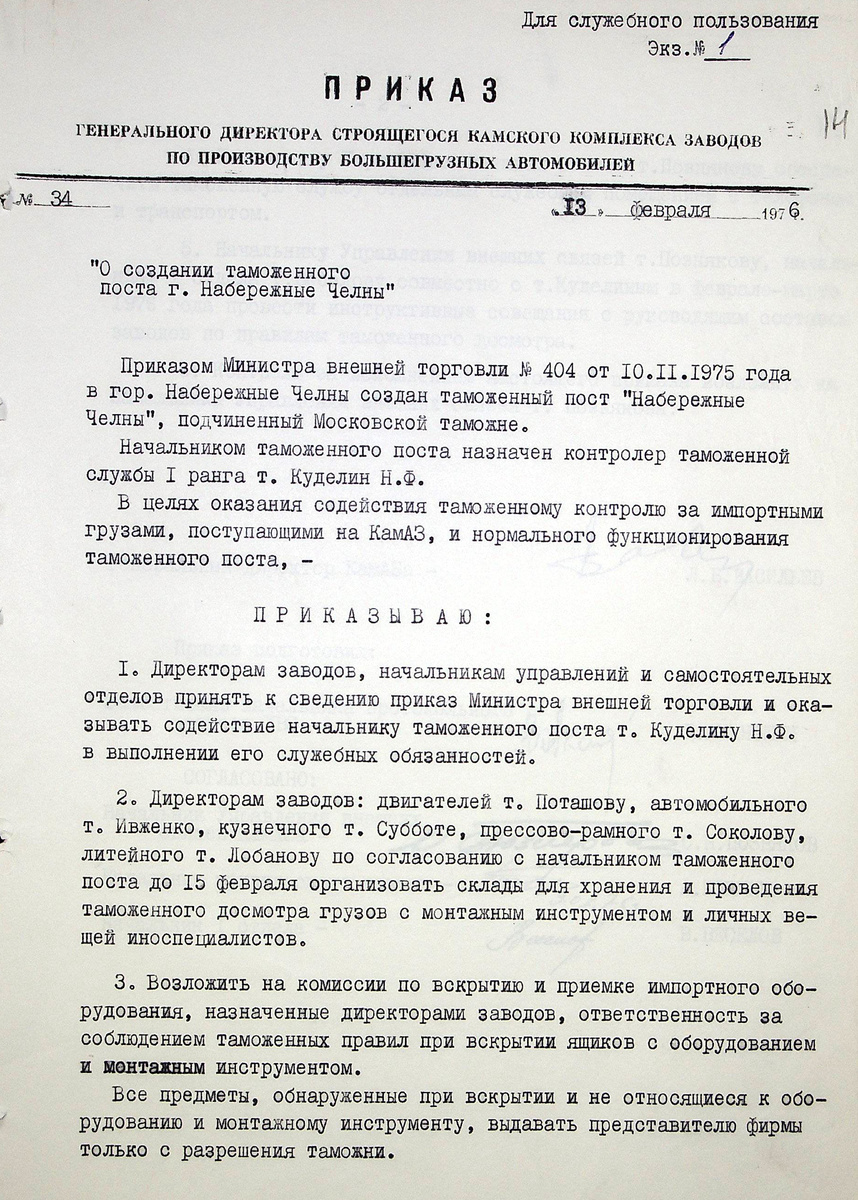 На сайте Татарстанской таможни (https://customs.tatarstan.ru/structure.htm?department_id=37026) написано, что Набережночелнинский таможенный пост создан в июне 1990 года. А в соответствии с приказом ГТК России от 29.07.1994 № 386 создана Набережночелнинская таможня. В «Энциклопедии города Набережные Челны», изданной в 2007 году, говорится о том, что городская таможня создана в 1994 году. Однако, история Набережночелнинской таможни началась 50 лет назад. И этому есть подтверждение. 10 ноября 1975 года в Набережных Челнах приказом министра внешней торговли СССР был создан Набережночелнинский таможенный пост с подчинением Московской таможне. Первым начальником Набережночелнинской таможни стал Куделин Н.Ф. Прочтите приказ генерального директора КАМАЗа №34 от 13 февраля 1976 года.