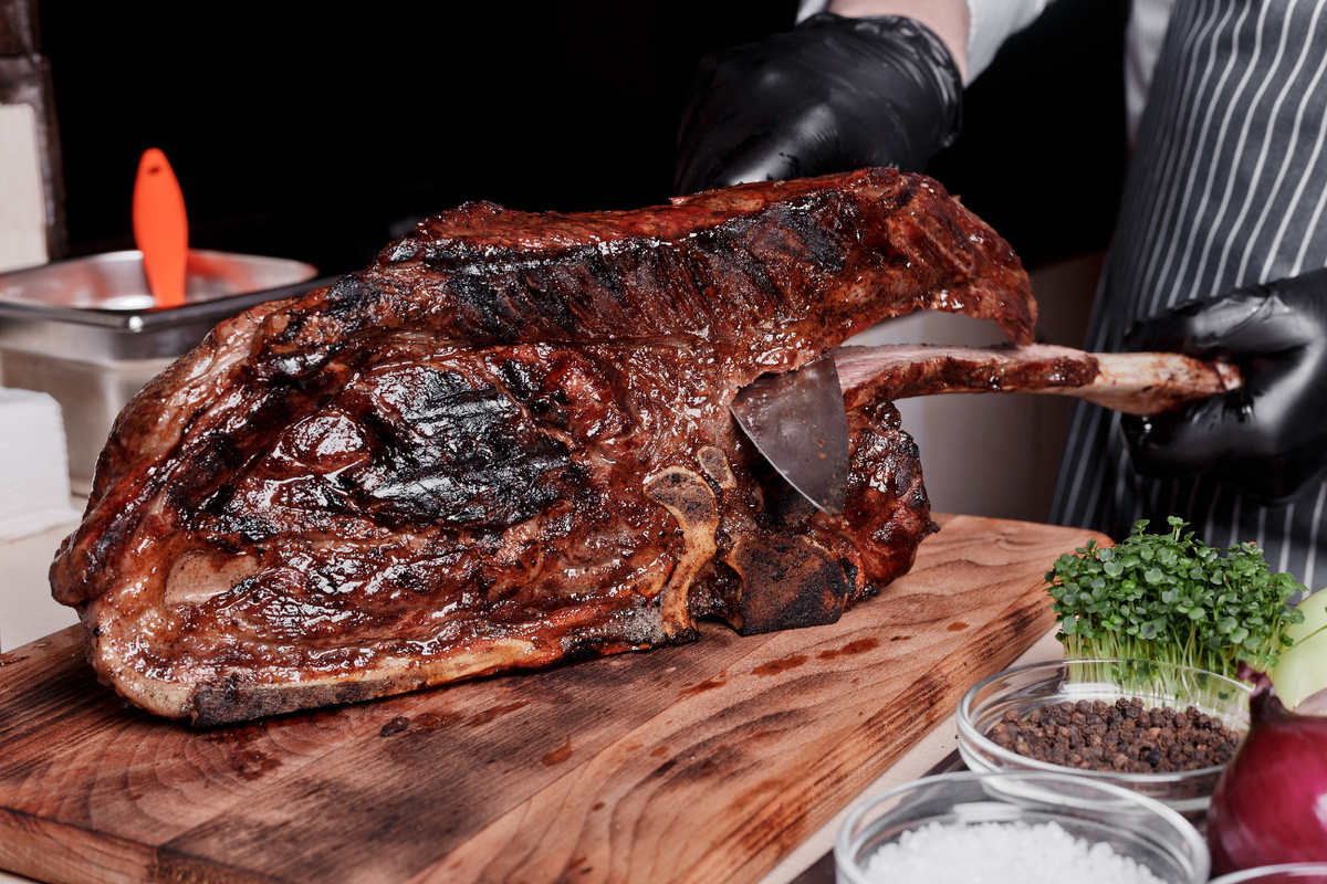 Есть блюда, которые нельзя готовить в одиночку. Их вкус раскрывается в компании — под треск углей, звон бокалов и разговоры до ночи. Один из таких героев — стейк Томагавк. Огромный кусок мраморной говядины с длинной костью — он выглядит впечатляюще и способен накормить целую компанию из 3–4 человек. 🔥 Подготовка к жарке Разожгите угли и дождитесь, когда они станут нежно-красного цвета — это идеальный момент. Решётку заранее прогрейте. Достаньте стейк из упаковки, обсушите его салфеткой — так мясо лучше прожарится и сохранит сок. Овощи (лук и помидор) разрежьте пополам, чтобы позже подпечь их на гриле. После жарки дайте стейку отдохнуть 2–3 минуты на деревянной доске — это нужно, чтобы сок равномерно распределился от центра к краям. 🍅 Подача Подавайте Томагавк с подпечёнными овощами или со свежим салатом. Не торопитесь — насладитесь каждым кусочком, как маленьким праздником. Хороший стейк — это не просто еда. Это уважение к мясу, к огню и к тем, с кем ты делишь этот момент.