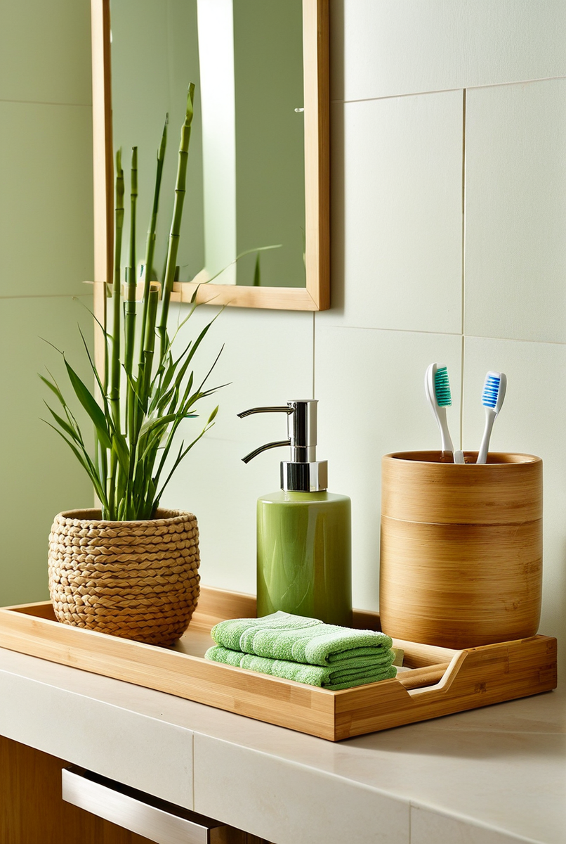 Экостиль стремится к природной гармонии. Для его создания выбирайте аксессуары из соответствующих материалов. Идеально подойдут предметы из бамбука или обработанного дерева: мыльницы, стаканы, органайзеры, решетки на пол в душевую. Плетеные корзины из джута или ротанга для белья и хранения мелочей станут прекрасным дополнением. Используйте текстиль из натуральных тканей (хлопок, лен) приглушенных, естественных оттенков: бежевого, песочного, оливкового. Дополните интерьер живыми влаголюбивыми растениями в керамических горшках и натуральными морскими губками.