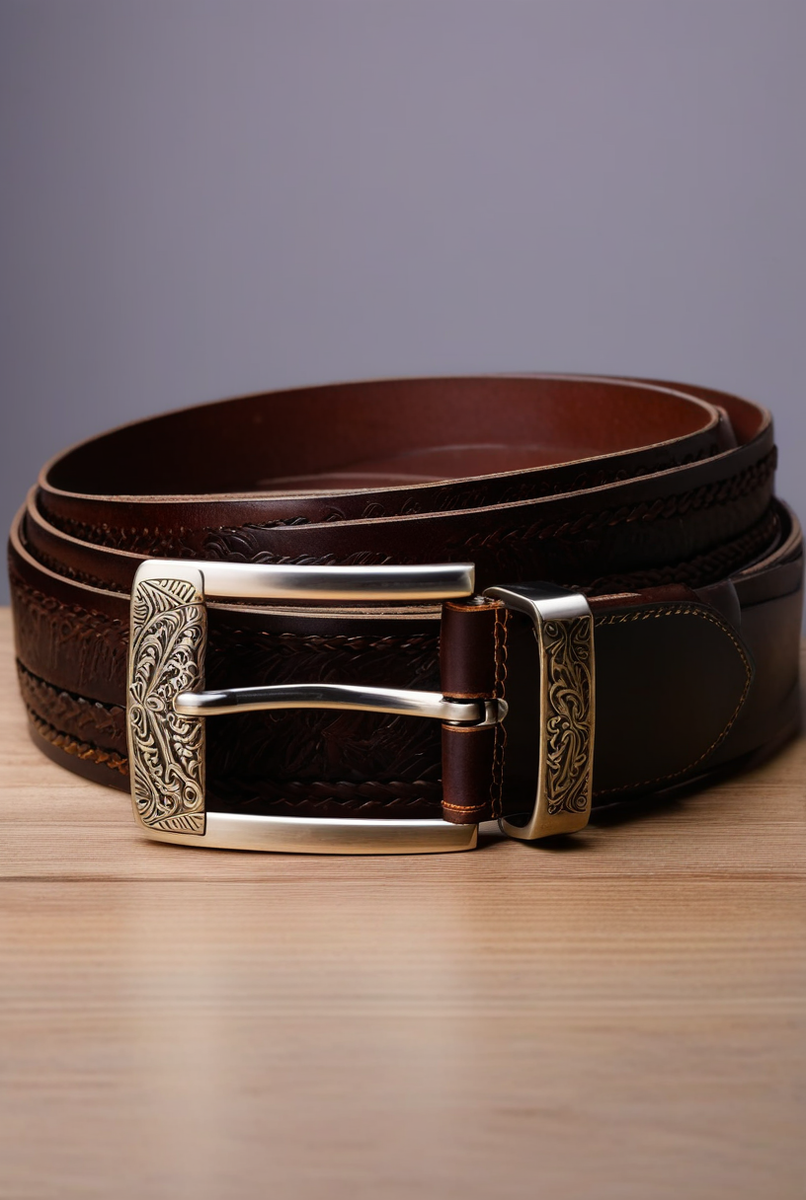 Материал — исключительно натуральная кожа. Воловья ценится за прочность‚ телячья, за мягкость и упругость‚ что является признаком высокого качества. Редкие варианты из крокодиловой или змеиной кожи в темных тонах также уместны. Поверхность ремня должна быть гладкой‚ слегка глянцевой‚ без узоров.