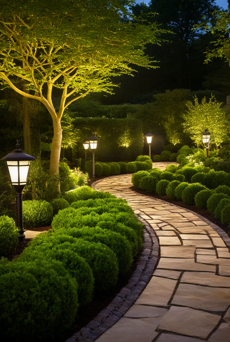 Для подсветки кустарников, деревьев и ступеней уместны мобильные или стационарные светильники высотой 0,5-1 метр. Грунтовые светильники подходят для акцентного освещения снизу, выделяя элементы. Декоративные светящиеся фигуры (шары, кубы) добавляют уникальности.