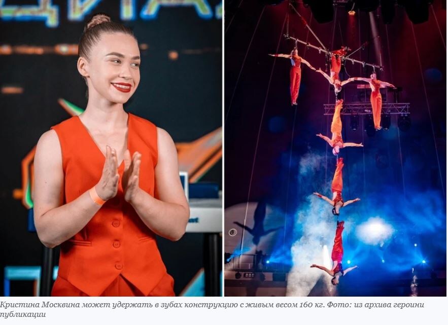 Сначала Кристина выступала в этом номере, а затем сама смогла повторить трюк, удержав в зубах конструкцию с тремя девушками общим весом 160 кг. Теперь же артистка цирка отправилась за новыми победами на шоу «Титаны», в котором борется с известными спортсменами и другими знаменитостями за главный приз - 10 миллионов рублей.