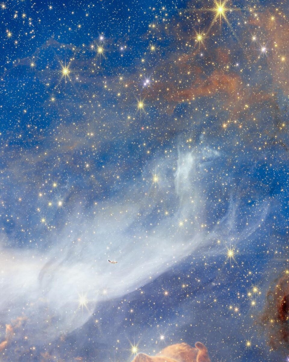 Белые "дутьки" и wispy (прозрачные) облака в изображении звёздного скопления Pismis 24 — это пыль и газ, рассеивающие свет молодых звёзд. На инфракрасных снимках с камеры NIRCam космического телескопа Джеймса Уэбба мы видим тысячи ярких звёзд разного размера и цвета, чей свет освещает окружающие их пылевые и газовые облака. Цвета на изображении несут информацию о составе и состоянии вещества: голубоватый оттенок соответствует горячему или ионизированному водороду; оранжевый — дымчатым пылевым молекулам, а красный — более холодному и плотному молекулярному водороду. Тёмные чёрные области указывают на самые плотные газовые скопления, не испускающие свет, а белые wispy области отражают и рассеивают свет звёзд.