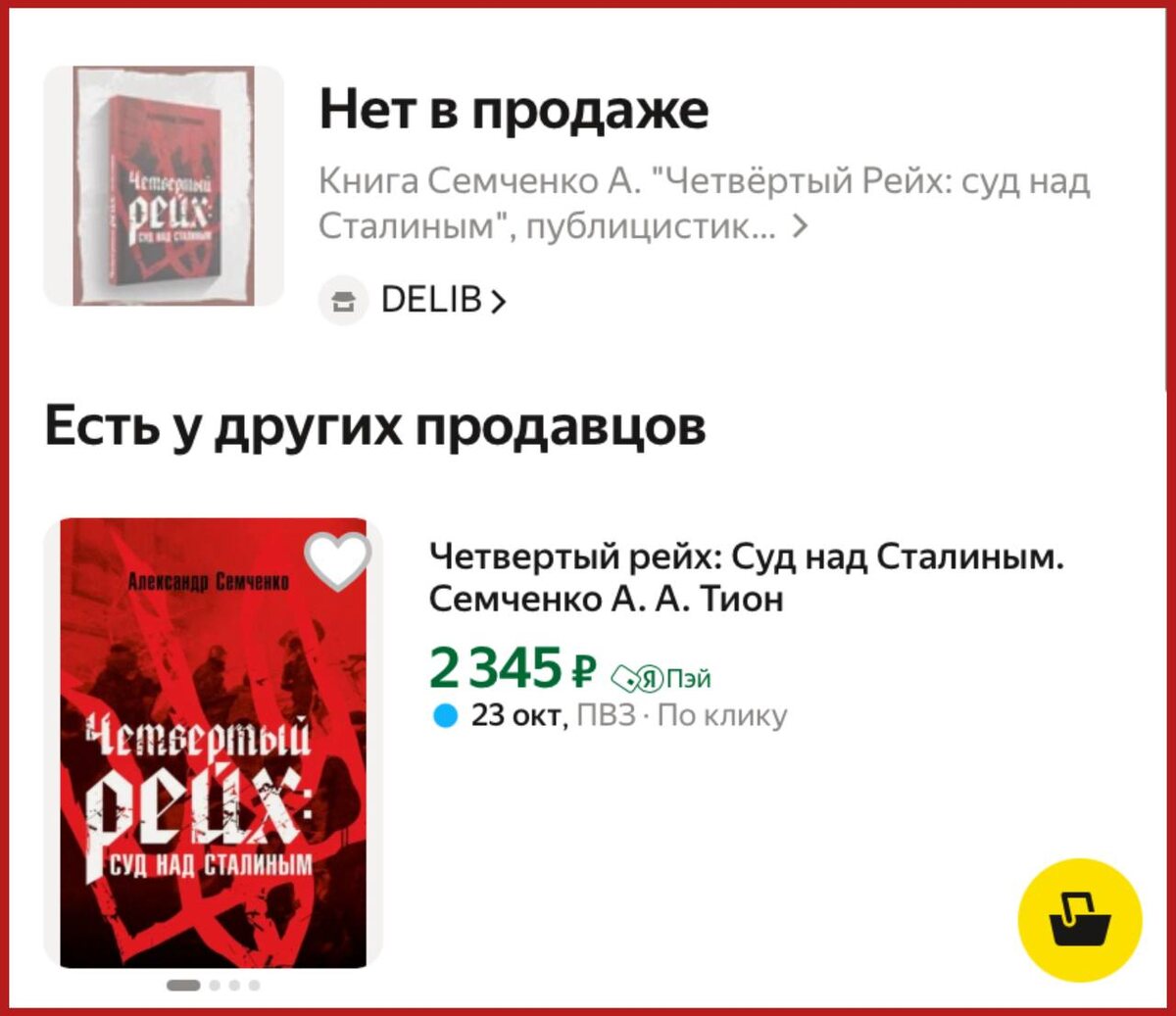 Цены на мою книгу «Четвертый Рейх» в некоторых магазинах - просто космос. Такое впечатление, что такие цены нарисовали специально, чтобы никто не покупал. К счастью, в интернет-магазинах цена почти в 3 раза ниже: https://www.ozon.ru/product/chetvertyy-reyh-sud-nad-stalinym-semchenko-a-a-2262536787/?__rr=1&abt_att=2&origin_referer=ozon.kz Правда, пишут, что это временная акция, которая вот-вот закончится. Но возможность успеть ещё есть Подпишись на Телеграм Александр Семченко