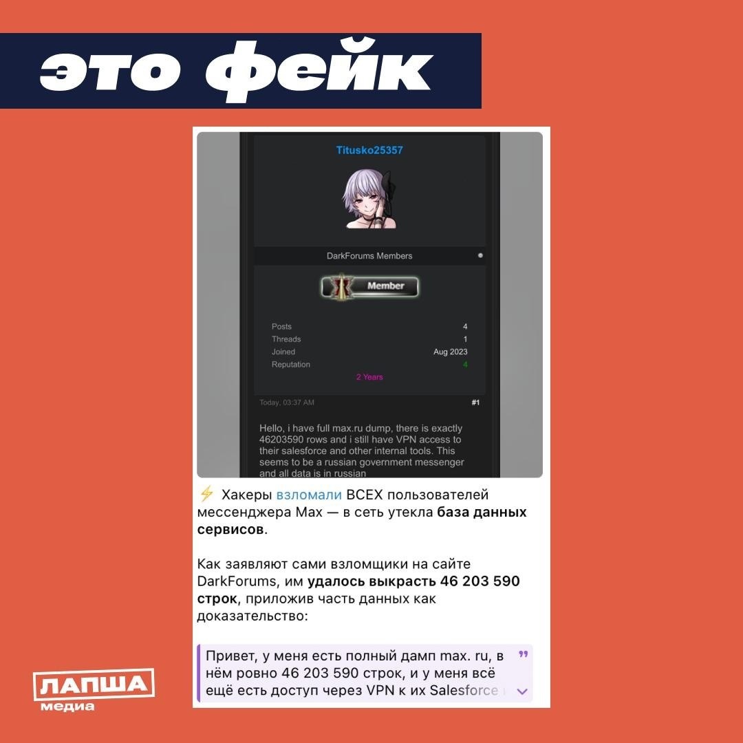 ⚡ Злоумышленники взломали аккаунты всех пользователей MAX? По некоторым данным, хакеры похитили более 46 миллионов строк конфиденциальной информации, включая личные данные, номера телефонов и другую персональную информацию. Эта фейк. Пресс-служба сервиса сообщила, что данные пользователей MAX надежно защищены, а информация об утечке является ложью, распространяемой анонимными источниками. MAX не использует облачную CRM-платформу Salesforce, через которую якобы произошла утечка данных. VK прекратил сотрудничество с этим инструментом еще в 2022 году. Утечка данных, о которой говорилось, не имеет отношения к MAX. Информация была собрана из различных источников, которые ранее сообщали о других инцидентах. Очевидно, что это очередная скоординированная попытка дискредитировать мессенджер. Источник: Лапша Медиа