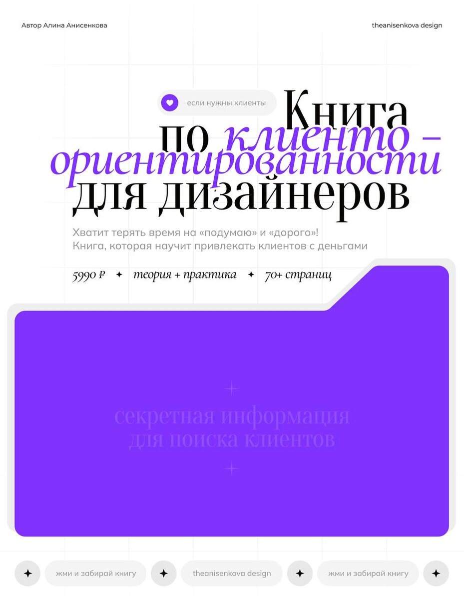 Я в дизайне больше 5 лет и 80% моих проектов — это постоянные клиенты и сарафанное радио. Я никогда не занималась холодными рассылками и не искала заказы на биржах. Но несмотря на это у меня сотни довольных отзывов от клиентов и база постоянных клиентов, со многими из которых мы работаем больше 4 лет. Начав собирать команду я начала замечать, что многие дизайнеры недооценивают этап работы с клиентом. Они отлично владеют программами, но теряются в коммуникации, боятся называть цену, не умеют работать с правками и презентовать свои идеи. В итоге - бесконечные правки, низкие чеки, выгорание и клиенты, которые «сами не знают, чего хотят». Это отнимает силы и убивает любовь к профессии 💔 Правда в том, что нас не учат главному - как превратить клиента в партнера, как защищать свои идеи и как вести проект так, чтобы он приносил и деньги, и удовольствие. Этот навык приходит только с опытом, часто - через боль и выгорание. Именно поэтому я решила упаковать все свои знания и методики в один