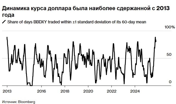 Несмотря на разнообразие событий, которые могли бы повлиять на волатильность, позитивные и негативные факторы уравновешивались, что поддерживало узкий торговый диапазон Рынок валют переживает период затишья, и активность торговли долларом заметно снизилась. По данным Bloomberg, за последние два месяца индекс доллара США оставался в узком диапазоне, отклоняясь от среднего значения лишь на 80% случаев. Это самый низкий уровень волатильности за последние десять лет. Снижение активности связано с ожиданием возможного прекращения работы правительства США и политической нестабильностью в мире, что увеличивает валютные риски. В то же время доллар получает поддержку благодаря изменению рыночных настроений и слабости других ключевых валют. Европейская экономика оказалась под давлением из-за бюджетного кризиса во Франции, что привело к снижению кредитного рейтинга страны. Это негативно сказалось на евро. Кроме того, в Японии новый премьер-министр Санаэ Такаити заявил о планах увеличить государст