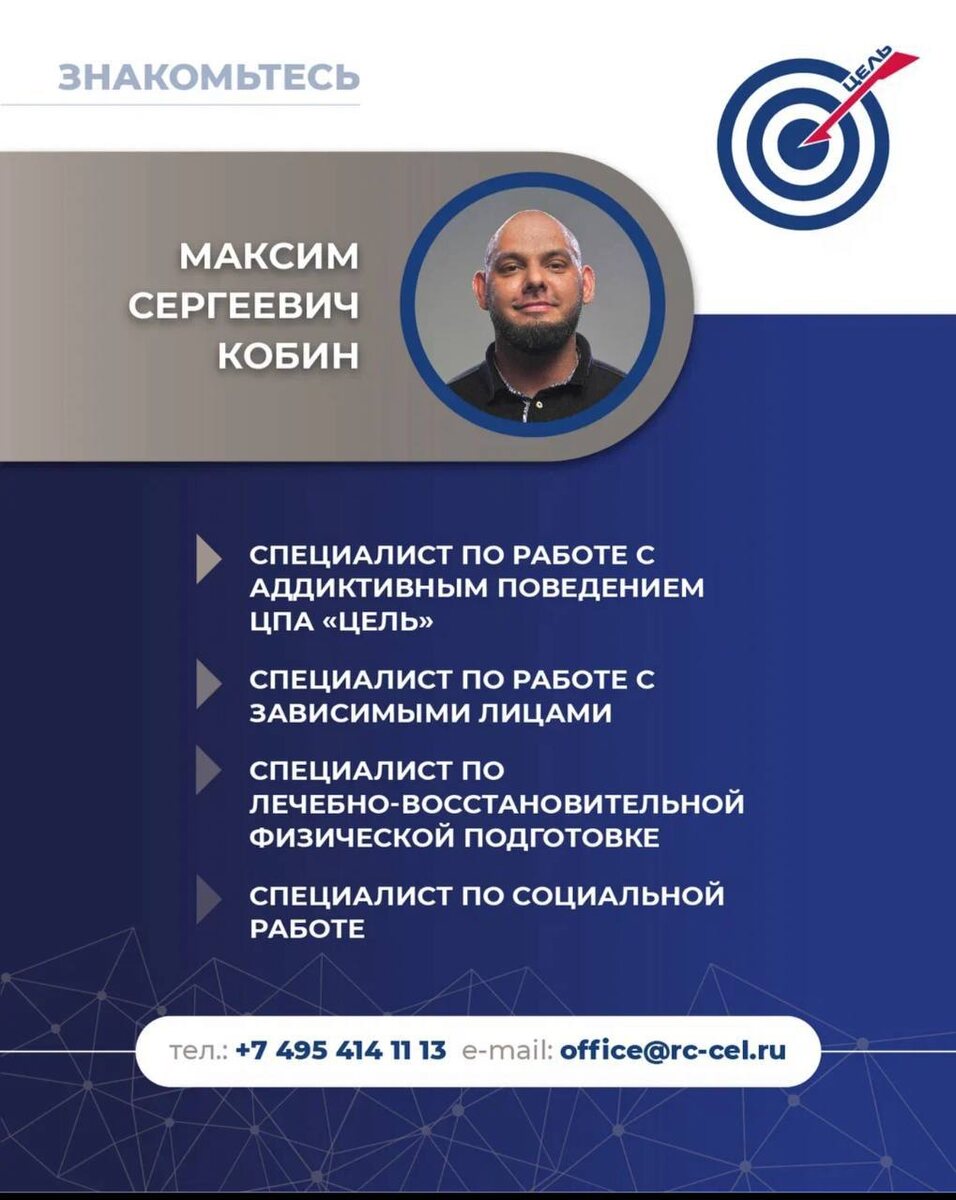 Дорогие подписчики и друзья нашего канала 🌼 С радостью представляем вам нашего специалиста — Кобина Максима Сергеевича, эксперта в области аддиктивного поведения, лечебно-восстановительной физической подготовки и социальной работы. Максим Сергеевич — профессионал с богатым опытом в работе с зависимостями и другим аддиктивным поведением. Он понимает, как физическое и эмоциональное здоровье взаимосвязаны, и развивает комплексные подходы к восстановлению и реабилитации. Максим Сергеевич проводит индивидуальные и групповые консультации, помогая людям осознать и преодолеть зависимое поведение, разрабатывает специальные программы физических нагрузок, которые помогают пациентам восстанавливаться как физически, так и психологически. Упражнения используются для улучшения настроения, снижения стресса и повышения общего психоэмоционального состояния. Мы рады, что в нашем центре работает такой высококвалифицированный и отзывчивый специалист, как Максим Сергеевич. Если у вас есть вопросы или