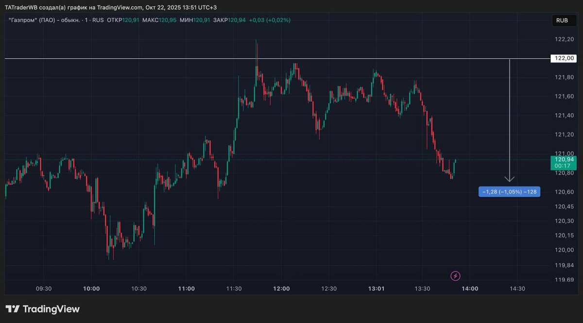 👉 Газпром от уровня сопротивления 122. Сходил на 1%, все как нужно.