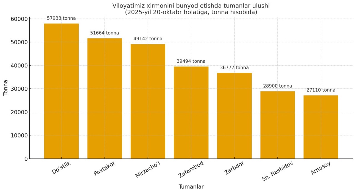 Жиззах вилояти пахтакорлари 20 октябрь куни, республикада тўртинчи бўлиб пахта топшириш шартномавий режасини бажаришди. Умумий хирмонга ҳисса қўшган туманлар ва етиштирилган ҳосил инфографикада☝️ Каналимизга обуна бўлинг ва энг сўнгги янгиликларни кузатиб боринг Jizzaxnews |Тelegram | Facebook | Dzen | YouTubе
