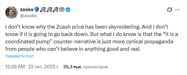 Я не знаю, почему цена Zcash взлетела до небес. И не знаю, упадет ли она обратно. Но я точно знаю, что контраргумент про «скоординированный памп» — не что иное, как циничная пропаганда людей, не способных поверить во что-то хорошее и настоящее.