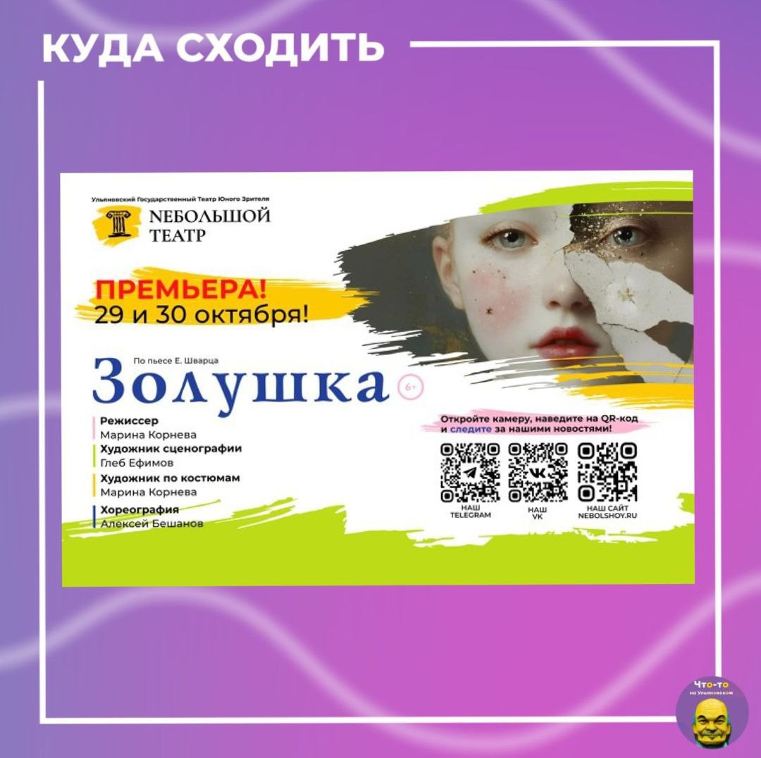 Спектакль "Золушка"🎭 Знаменитую историю Золушки расскажет режиссер Марина Корнева и труппа NEБОЛЬШОГО ТЕАТРА. Зрителей ждет история о каждом из нас, о том как непросто вырваться из паутины страхов, сомнений, заблуждений и шагнуть навстречу своему счастью, прокладывая путь к себе, своему сердцу! 📆Когда: 29 октября в 18:30 📍Где: Nebolshoy театр (ул. Пушкинская, д.1\11) #куда_пойти_ул