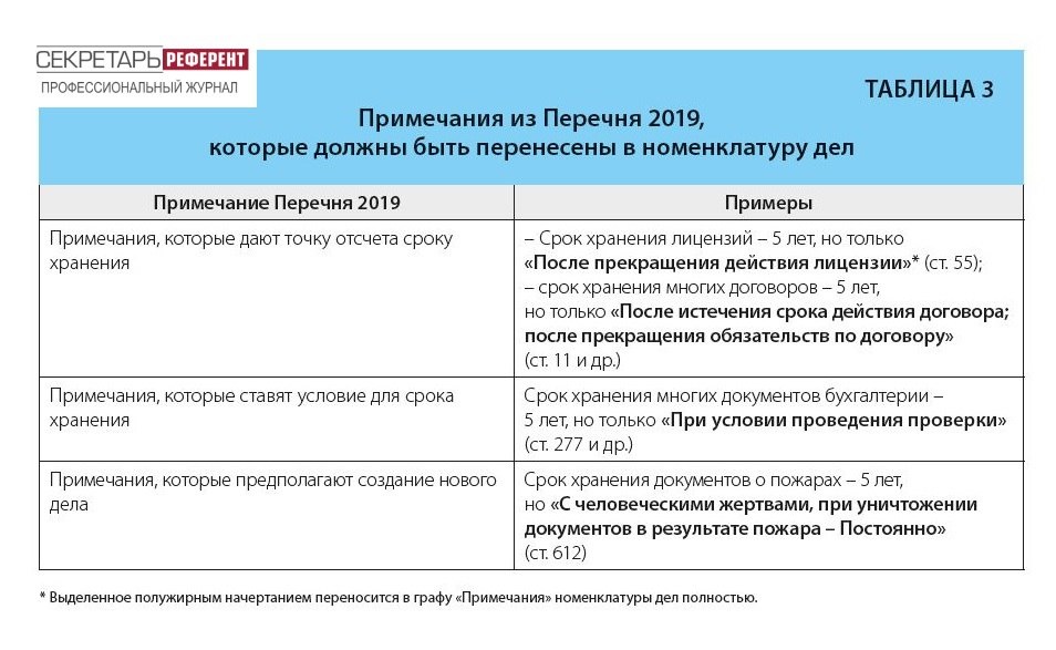 В Перечне типовых управленческих архивных документов, образующихся в процессе деятельности государственных органов, органов местного самоуправления и организаций, с указанием сроков их хранения (утв. приказом Росархива от 20.12.2019 № 236), который используется для определения сроков хранения документов, имеются примечания. Они должны быть перенесены в номенклатуру дел в одноименную графу (Таблица).