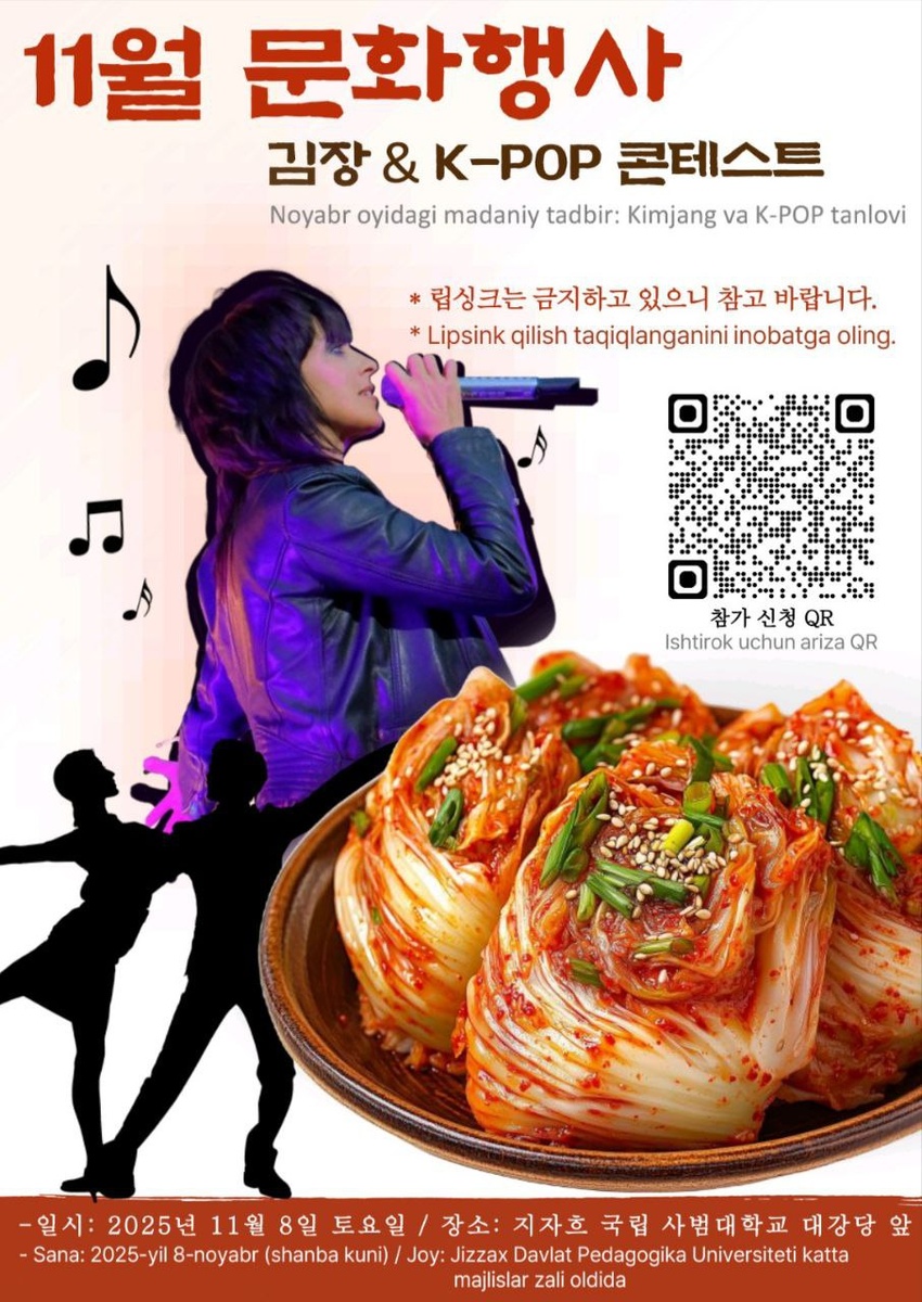 Корея маданиятига қизиқувчилар учун ажойиб имконият 8 ноябрь куни корейс миллий ошхонаси билан танишиш ва дунё бўйлаб ўтказиладиган К-POP танловида қатнашиш учун ҳали вақтингиз бор. QR кодни сканер қилинг ва биринчи 100 нафар иштирокчи сафида тадбирда қатнашинг. Каналимизга обуна бўлинг ва энг сўнгги янгиликларни кузатиб боринг Jizzaxnews |Тelegram | Facebook | Dzen | YouTubе